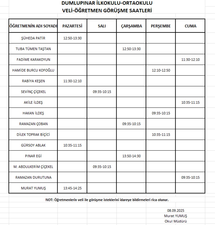 2025-2026 EĞİTİM ÖĞRETİM YILI VELİ-ÖĞRETMEN GÖRÜŞ SAATLERİ